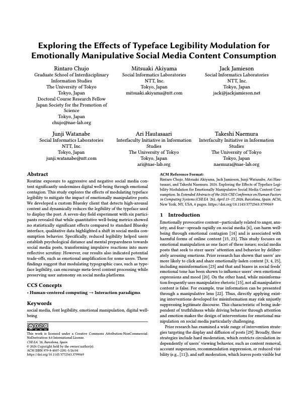 Rintaro Chujo, Mitsuaki Akiyama, Jack Jamieson, Junji Watanabe, Ari Hautasaari, and Takeshi Naemura. 2026. Exploring the Effects of Typeface Legibility Modulation for Emotionally Manipulative Social Media Content Consumption. In Proceedings of the Extended Abstracts of the 2026 CHI Conference on Human Factors in Computing Systems (CHI EA ’26). Association for Computing Machinery, New York, NY, USA, Article 282, 1–6.